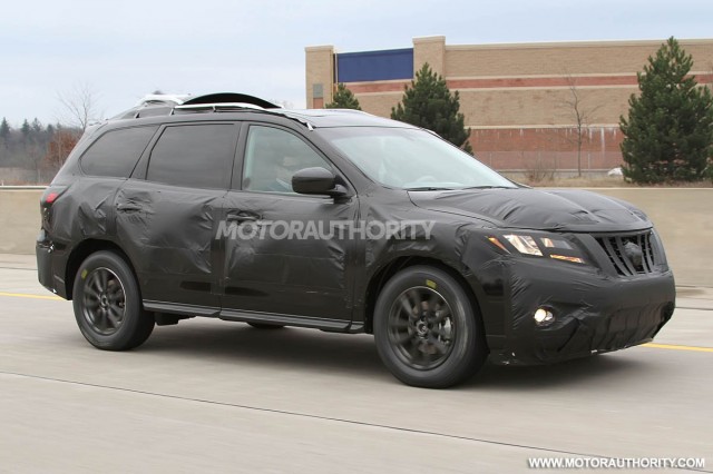 2013 Nissan Pathfinder Spy ShotsThe 2013 Nissan Pathfinder Concept is not even out yet--it was just announced for a Detroit Auto Show debut today--and already our spies have caught it testing on U.S. roads. It's still heavily disguised, but we can derive a few details from the shots. First of all is its decidedly more car-like...