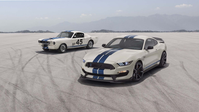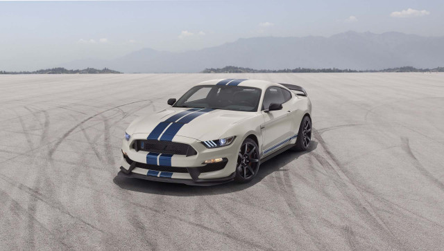Get the 2020 Ford Mustang Shelby GT350 in Wimbledon White with Guardsman Blue stripesThe combination recalls the livery used on Ford Shelby GT350 race cars that competed extensively back in the 1960s.