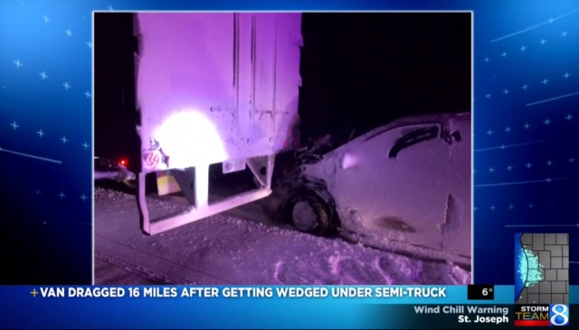 Minivan Is Wedged Under Semi In Snow Storm, Then Dragged For 16 Miles: VideoA family of four took an unexpected journey recently when their minivan became extra cargo for one semi-truck driver. While driving at 2am in a snowstorm, the driver of the minivan crashed into the back of the truck and the family hauler got stuck there. MUST SEE: LaFerrari Demolishes Bugatti...